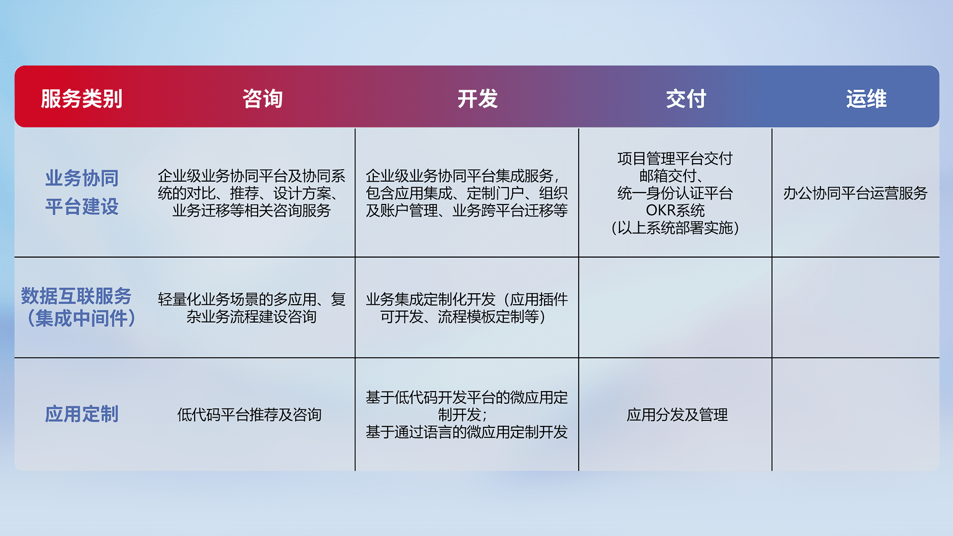 针对钉钉、、、企微、、IDaas等平台级产品提供产品的规划、、、方案、、、、交付、、、定制化开发等服务,,,,实现如统一协同办公、、、智能客户服务、、混合会议管理、、、、智能数据查询、、、、等业务场景,,实现数字化转型。。